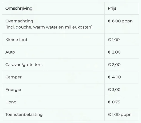 Totaal voor 2 personen per nacht (auto, caravan, energie en toeristenbelasting) = € 21,00